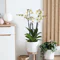 Cette plante d’orchidée (phalaenopsis) blanche dans son contenant est sublimé par un travail élégant d’accessoires.
